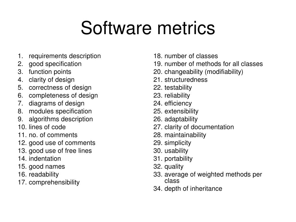 requirements description good specification function points clarity of design correctness of design completeness of design diagrams of design modules specification algorithms description lines of code no. of comments good use of comments good use of free lines indentation good names readability comprehensibility number of classes number of methods for all classes changeability (modifiability) structuredness testability reliability efficiency extensibility adaptability clarity of documentation maintainability simplicity usability portability quality average of weighted methods per class depth of inheritance Software metrics