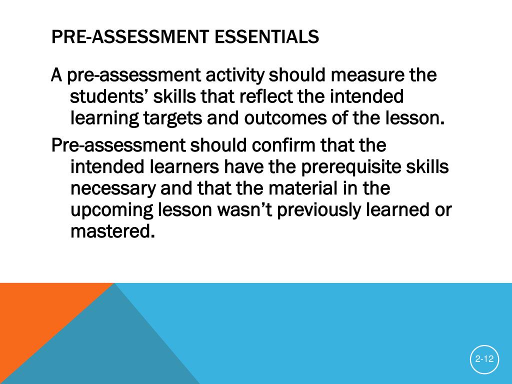 Pre-Assessment Essentials • A pre-assessment activity should measure the students’ skills that reflect the intended learning targets and outcomes of the lesson. • Pre-assessment should confirm that the intended learners have the prerequisite skills necessary and that the material in the upcoming lesson wasn’t previously learned or mastered.