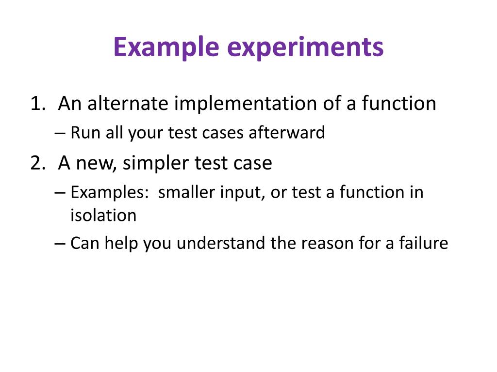 Example experiments • An alternate implementation of a function • Run all your test cases afterward • A new, simpler test case • Examples: smaller input, or test a function in isolation • Can help you understand the reason for a failure