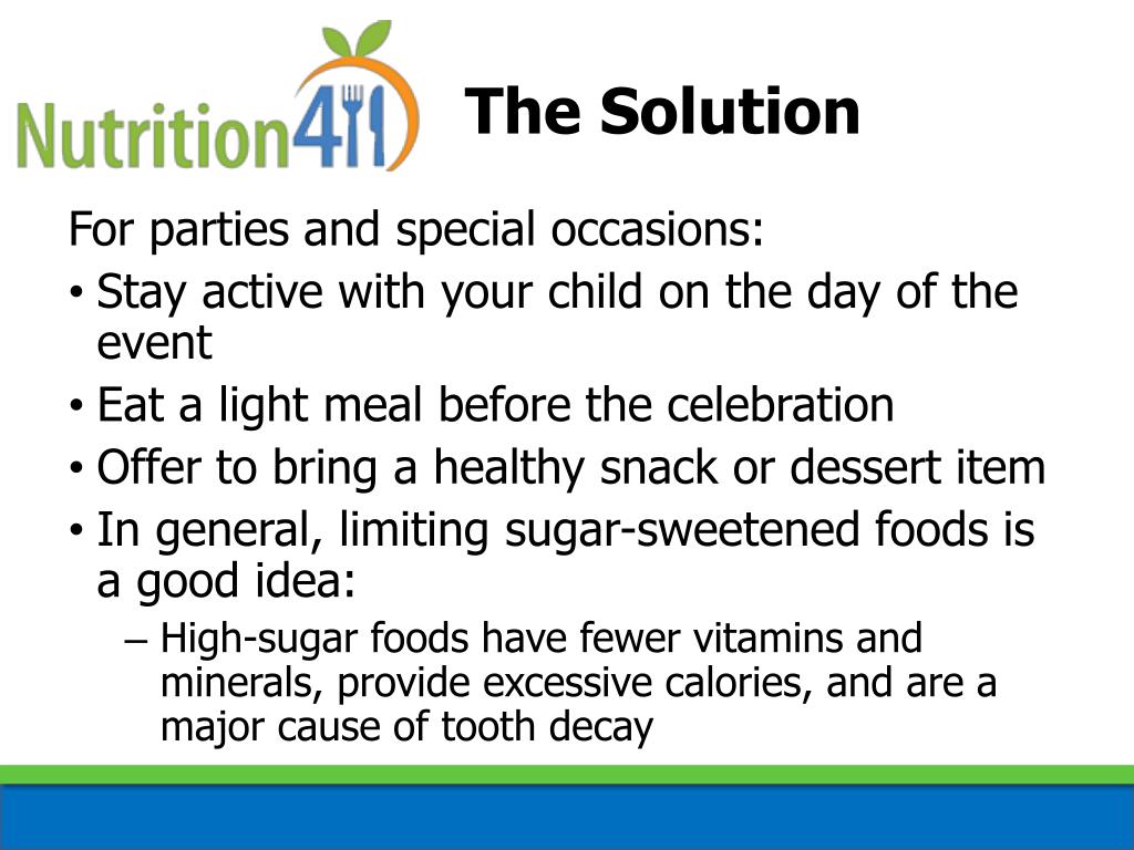 The Solution For parties and special occasions: • Stay active with your child on the day of the event • Eat a light meal before the celebration • Offer to bring a healthy snack or dessert item • In general, limiting sugar-sweetened foods is a good idea: • High-sugar foods have fewer vitamins and minerals, provide excessive calories, and are a major cause of tooth decay