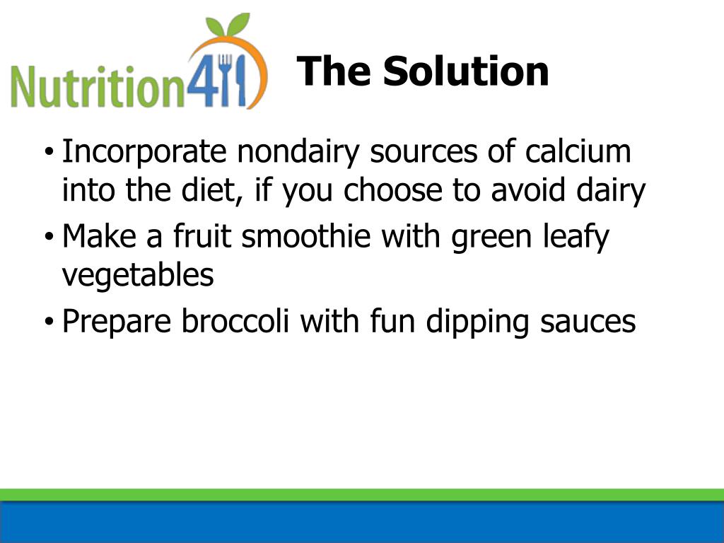 The Solution • Incorporate nondairy sources of calcium into the diet, if you choose to avoid dairy • Make a fruit smoothie with green leafy vegetables • Prepare broccoli with fun dipping sauces