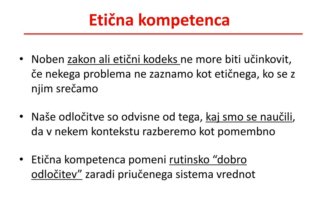Etičnakompetenca • Nobenzakonalietičnikodeksne more bitiučinkovit, čenekegaproblema ne zaznamokotetičnega, ko se z njimsrečamo • Našeodločitve so odvisne od tega, kajsmo se naučili, da v nekemkonteksturazberemokotpomembno • Etičnakompetencapomenirutinsko “dobroodločitev”zaradipriučenegasistemavrednot