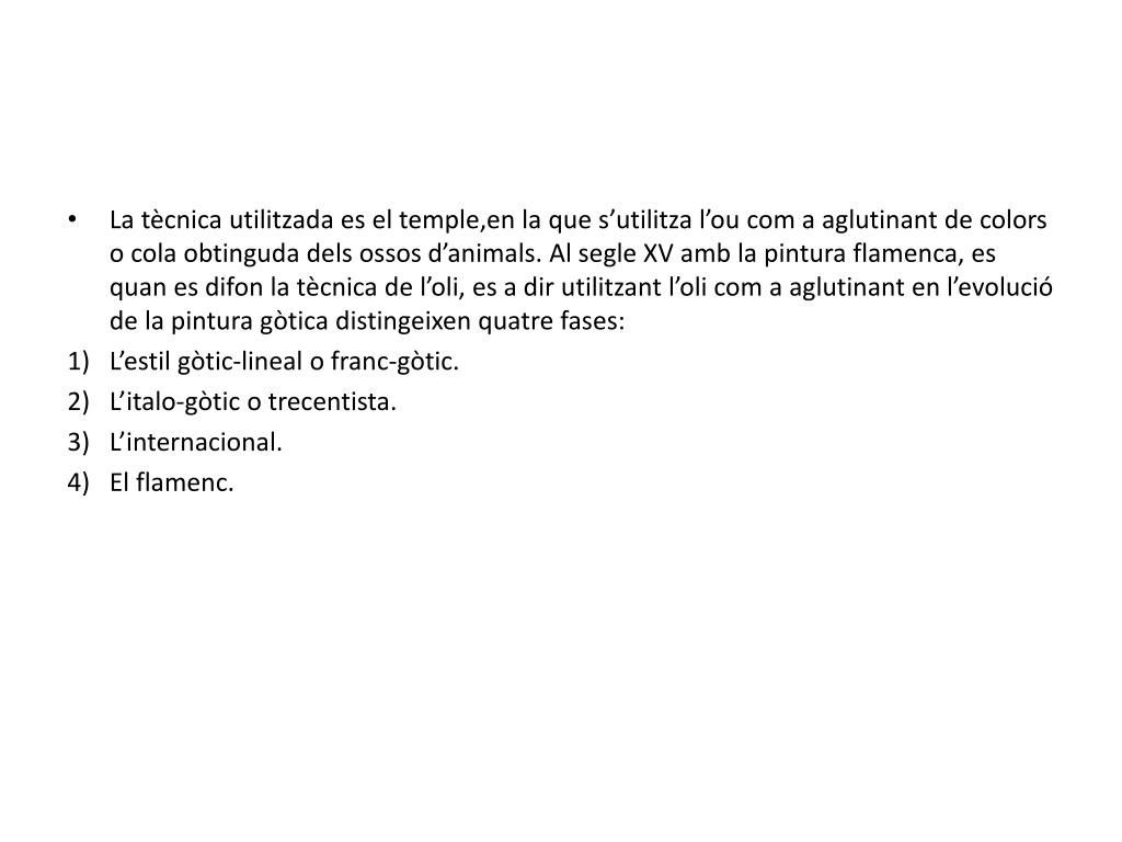 La tècnica utilitzada es el temple,en la que s’utilitza l’ou com a aglutinant de colors o cola obtinguda dels ossos d’animals. Al segle XV amb la pintura flamenca, es quan es difon la tècnica de l’oli, es a dir utilitzant l’oli com a aglutinant en l’evolució de la pintura gòtica distingeixen quatre fases: • L’estil gòtic-lineal o franc-gòtic. • L’italo-gòtic o trecentista. • L’internacional. • El flamenc.