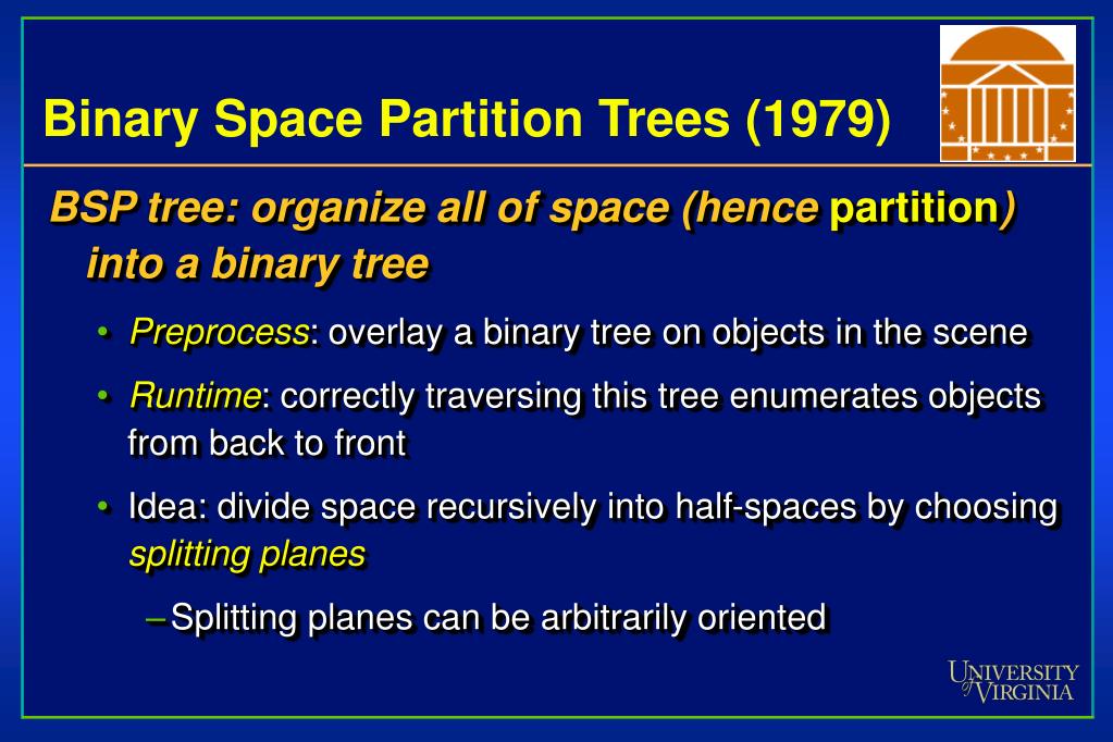 Binary Space Partition Trees (1979) • BSP tree: organize all of space (hence partition)into a binary tree • Preprocess: overlay a binary tree on objects in the scene • Runtime: correctly traversing this tree enumerates objects from back to front • Idea: divide space recursively into half-spaces by choosing splitting planes • Splitting planes can be arbitrarily oriented