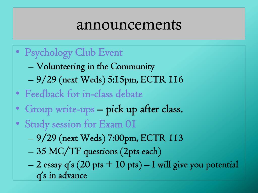 announcements • Psychology Club Event • Volunteering in the Community • 9/29 (next Weds) 5:15pm, ECTR 116 • Feedback for in-class debate • Group write-ups – pick up after class. • Study session for Exam 01 • 9/29 (next Weds) 7:00pm, ECTR 113 • 35 MC/TF questions (2pts each) • 2 essay q’s (20 pts + 10 pts) – I will give you potential q’s in advance