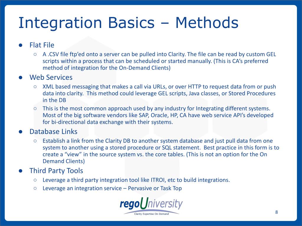 Integration Basics – Methods • Flat File • A .CSV file ftp’ed onto a server can be pulled into Clarity. The file can be read by custom GEL scripts within a process that can be scheduled or started manually. (This is CA’s preferred method of integration for the On-Demand Clients) • Web Services • XML based messaging that makes a call via URLs, or over HTTP to request data from or push data into clarity. This method could leverage GEL scripts, Java classes, or Stored Procedures in the DB • This is the most common approach used by any industry for Integrating different systems. Most of the big software vendors like SAP, Oracle, HP, CA have web service API’s developed for bi-directional data exchange with their systems. • Database Links • Establish a link from the Clarity DB to another system database and just pull data from one system to another using a stored procedure or SQL statement. Best practice in this form is to create a “view” in the source system vs. the core tables. (This is not an option for the On Demand Clients) • Third Party Tools • Leverage a third party integration tool like ITROI, etc to build integrations. • Leverage an integration service – Pervasive or Task Top