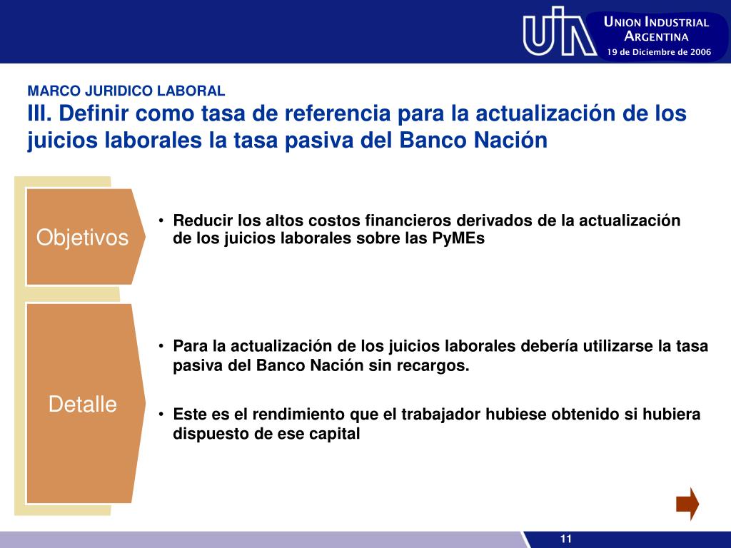 MARCO JURIDICO LABORAL III. Definir como tasa de referencia para la actualización de los juicios laborales la tasa pasiva del Banco Nación Objetivos • Reducir los altos costos financieros derivados de la actualización de los juicios laborales sobre las PyMEs Detalle • Para la actualización de los juicios laborales debería utilizarse la tasa pasiva del Banco Nación sin recargos. • Este es el rendimiento que el trabajador hubiese obtenido si hubiera dispuesto de ese capital