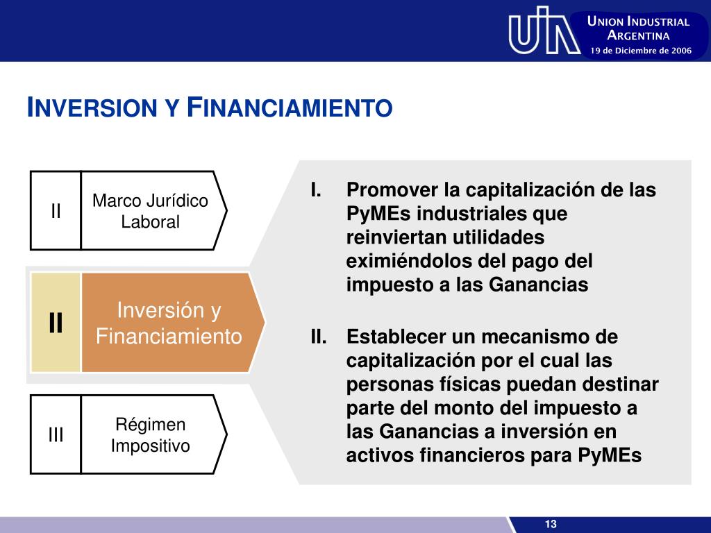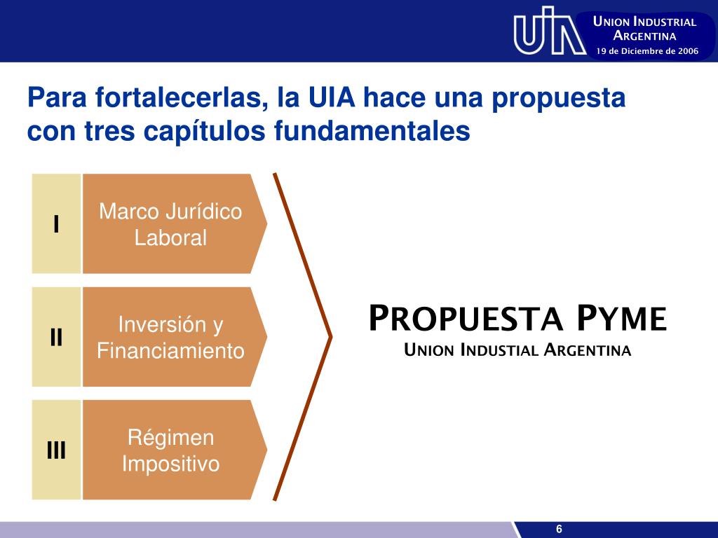 Para fortalecerlas, la UIA hace una propuesta con tres capítulos fundamentales I Marco Jurídico Laboral II Inversión y Financiamiento PROPUESTA PYME UNION INDUSTIALARGENTINA III Régimen Impositivo