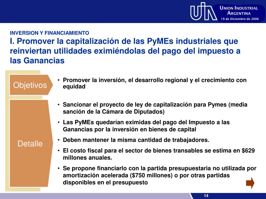 INVERSION Y FINANCIAMIENTO I. Promover la capitalización de las PyMEs industriales que reinviertan utilidades eximiéndolas del pago del impuesto a las Ganancias Objetivos • Promover la inversión, el desarrollo regional y el crecimiento con equidad • Sancionar el proyecto de ley de capitalización para Pymes (media sanción de la Cámara de Diputados) • Las PyMEs quedarían eximidas del pago del Impuesto a las Ganancias por la inversión en bienes de capital • Deben mantener la misma cantidad de trabajadores. • El costo fiscal para el sector de bienes transables se estima en $629 millones anuales. • Se propone financiarlo con la partida presupuestaria no utilizada por amortización acelerada ($750 millones) o por otras partidas disponibles en el presupuesto Detalle