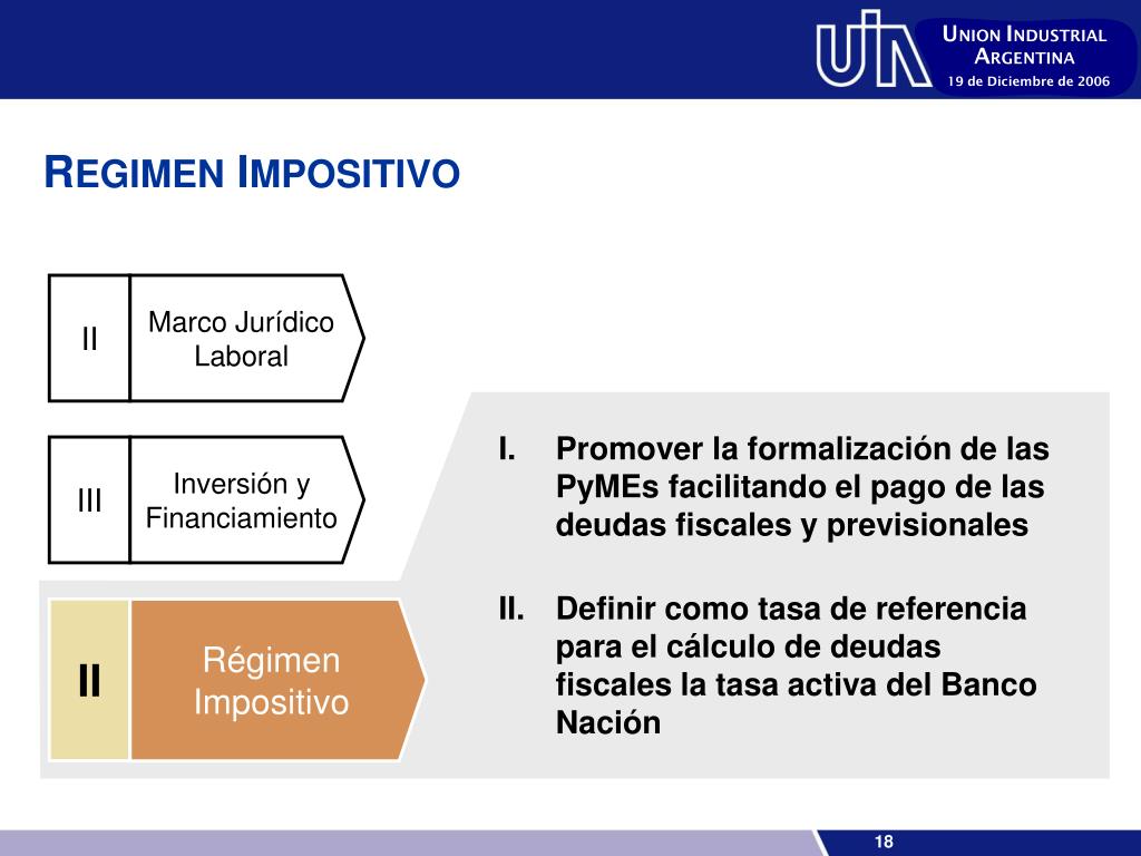 REGIMEN IMPOSITIVO II Marco Jurídico Laboral • Promover la formalización de las PyMEs facilitando el pago de las deudas fiscales y previsionales • Definir como tasa de referencia para el cálculo de deudas fiscales la tasa activa del Banco Nación III Inversión y Financiamiento II Régimen Impositivo