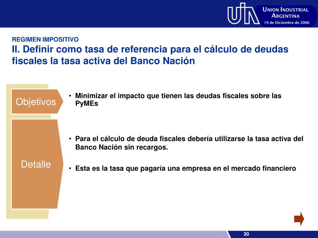 REGIMEN IMPOSITIVO II. Definir como tasa de referencia para el cálculo de deudas fiscales la tasa activa del Banco Nación Objetivos • Minimizar el impacto que tienen las deudas fiscales sobre las PyMEs Detalle • Para el cálculo de deuda fiscales debería utilizarse la tasa activa del Banco Nación sin recargos. • Esta es la tasa que pagaría una empresa en el mercado financiero