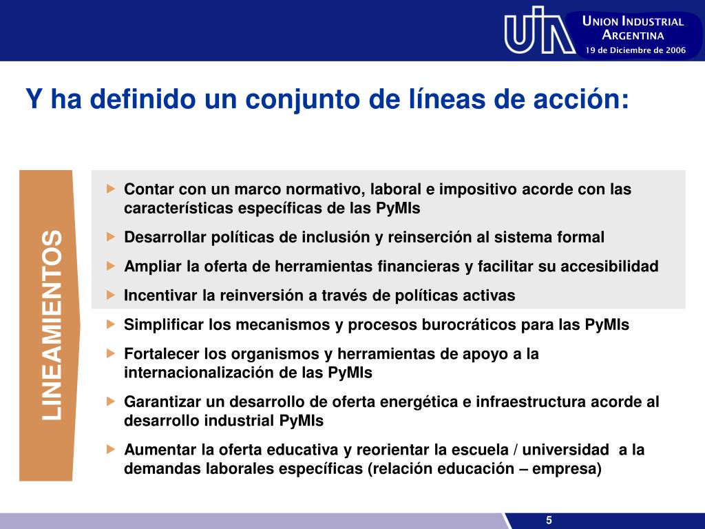 Y ha definido un conjunto de líneas de acción: LINEAMIENTOS • Contar con un marco normativo, laboral e impositivo acorde con las características específicas de las PyMIs • Desarrollar políticas de inclusión y reinserción al sistema formal • Ampliar la oferta de herramientas financieras y facilitar su accesibilidad • Incentivar la reinversión a través de políticas activas • Simplificar los mecanismos y procesos burocráticos para las PyMIs • Fortalecer los organismos y herramientas de apoyo a la internacionalización de las PyMIs • Garantizar un desarrollo de oferta energética e infraestructura acorde al desarrollo industrial PyMIs • Aumentar la oferta educativa y reorientar la escuela / universidad a la demandas laborales específicas (relación educación – empresa)