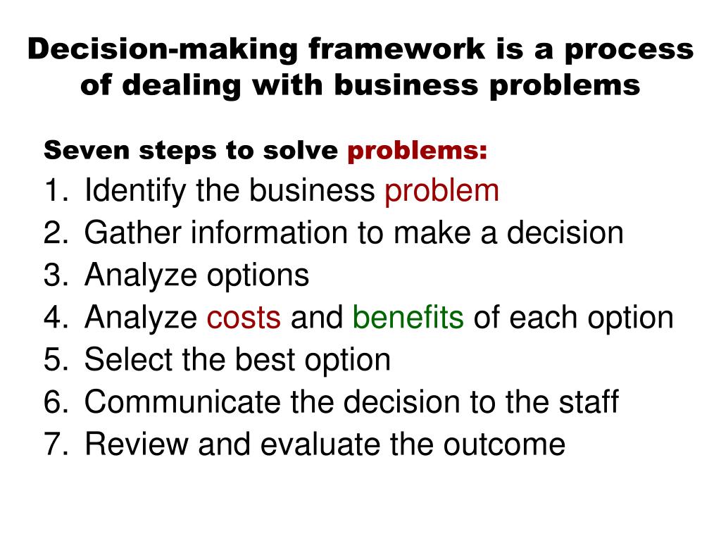 Decision-making framework is a process of dealing with business problems Seven steps to solve problems: • Identify the business problem • Gather information to make a decision • Analyze options • Analyze costs and benefits of each option • Select the best option • Communicate the decision to the staff • Review and evaluate the outcome