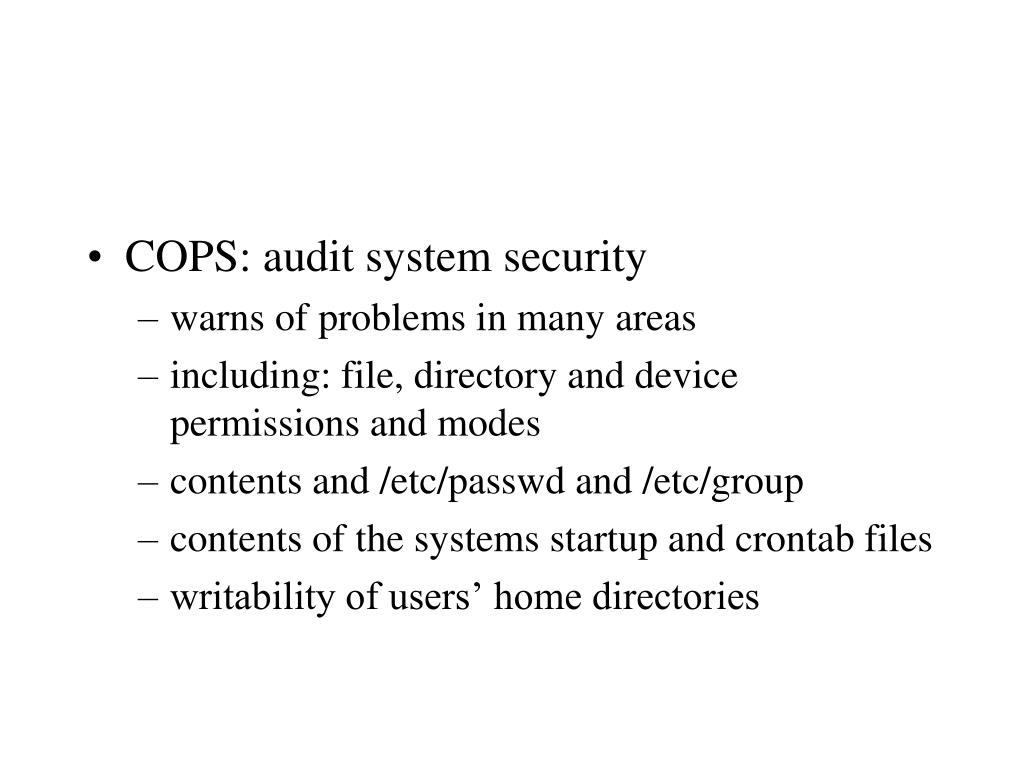COPS: audit system security • warns of problems in many areas • including: file, directory and device permissions and modes • contents and /etc/passwd and /etc/group • contents of the systems startup and crontab files • writability of users’ home directories