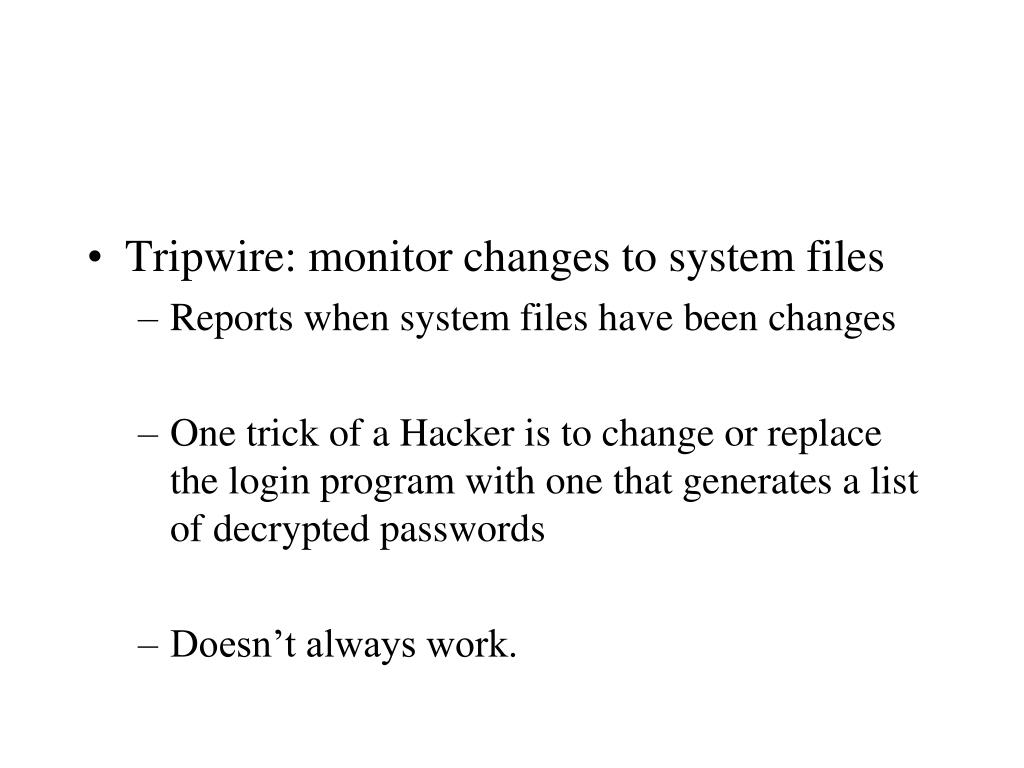 Tripwire: monitor changes to system files • Reports when system files have been changes • One trick of a Hacker is to change or replace the login program with one that generates a list of decrypted passwords • Doesn’t always work.