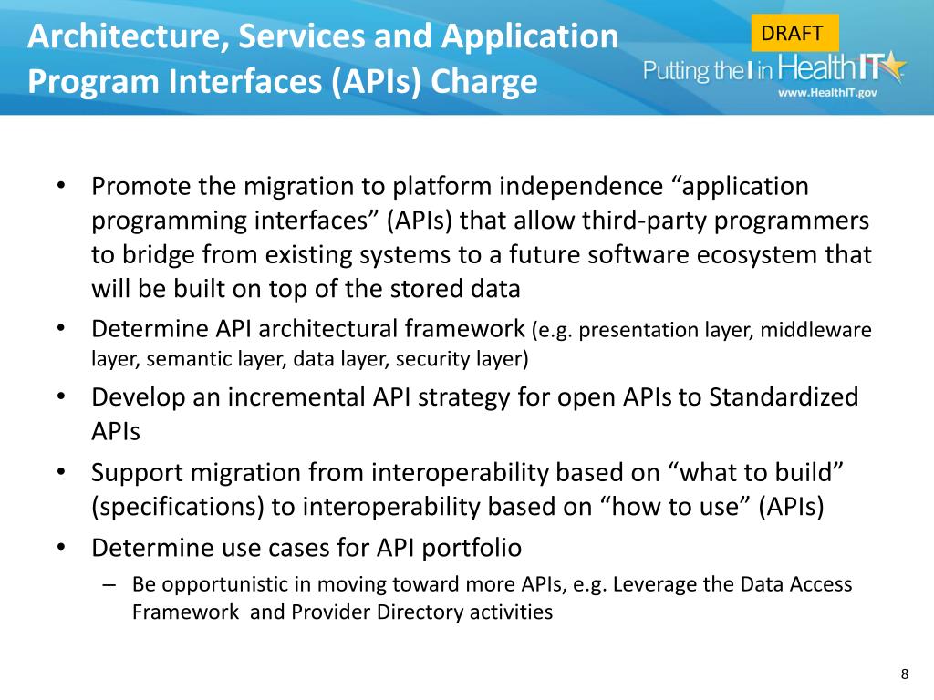 Architecture, Services and Application Program Interfaces (APIs) Charge DRAFT • Promote the migration to platform independence “application programming interfaces” (APIs) that allow third-party programmers to bridge from existing systems to a future software ecosystem that will be built on top of the stored data • Determine API architectural framework (e.g. presentation layer, middleware layer, semantic layer, data layer, security layer) • Develop an incremental API strategy for open APIs to Standardized APIs • Support migration from interoperability based on “what to build” (specifications) to interoperability based on “how to use” (APIs) • Determine use cases for API portfolio • Be opportunistic in moving toward more APIs, e.g. Leverage the Data Access Framework and Provider Directory activities