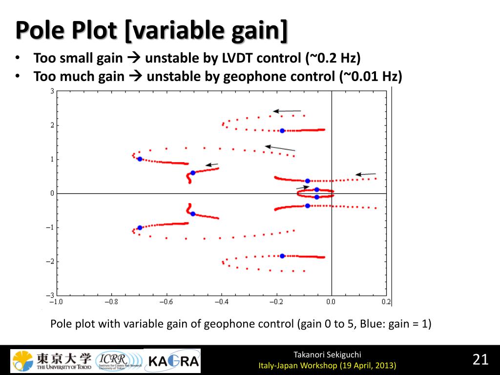 Pole Plot [variable gain] Too small gain unstable by LVDT control (~0.2 Hz) Too much gain unstable by geophone control (~0.01 Hz) Pole plot with variable gain of geophone control (gain 0 to 5, Blue: gain = 1)