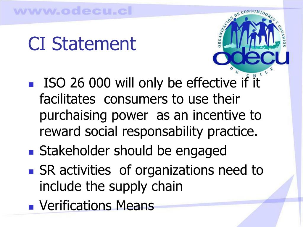 CI Statement • ISO 26 000 will only be effective if it facilitates consumers to use their purchaising power as an incentive to reward social responsability practice. • Stakeholder should be engaged • SR activities of organizations need to include the supply chain • Verifications Means