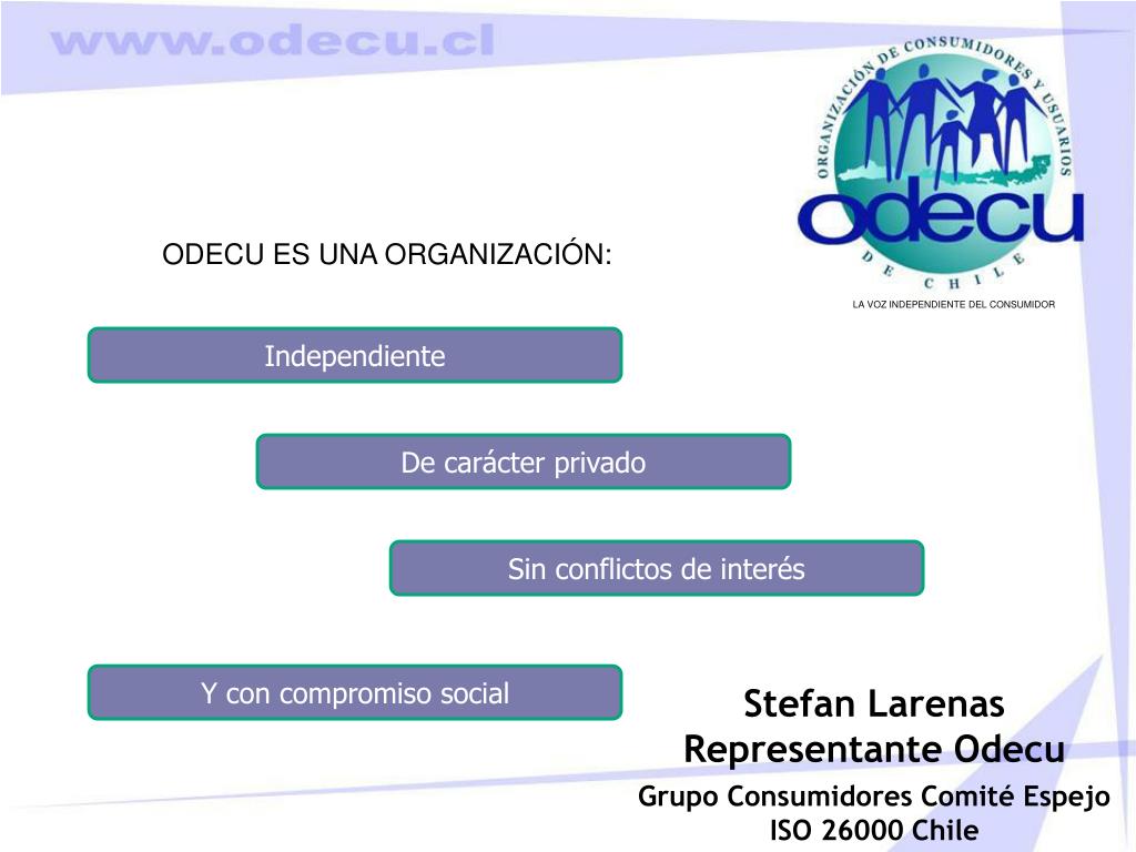 ODECU ES UNA ORGANIZACIÓN:. LA VOZ INDEPENDIENTE DEL CONSUMIDOR. Independiente. De carácter privado. Sin conflictos de interés. Y con compromiso social. Stefan Larenas Representante Odecu Grupo Consumidores Comité Espejo ISO 26000 Chile. Consumers International World Congress 2011.