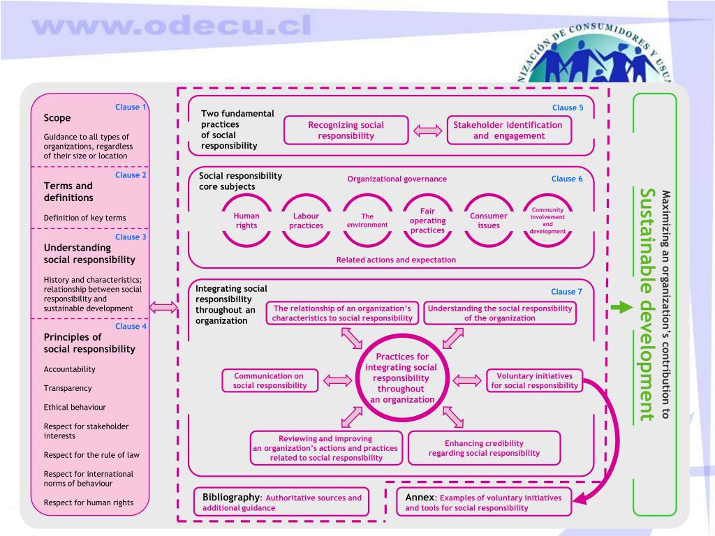Human rights Labour practices The environment Fair operating practices Consumer issues Community involvement and development Clause 1 Scope Guidance to all types of organizations, regardless of their size or location Clause 2 Terms and definitions Definition of key terms Clause 3 Understanding social responsibility History and characteristics; relationship between social responsibility and sustainable development Clause 4 Principles of social responsibility Accountability Transparency Ethical behaviour Respect for stakeholder interests Respect for the rule of law Respect for international norms of behaviour Respect for human rights Clause 5 Two fundamental practices of social responsibility Recognizing social responsibility Stakeholder identification and engagement Social responsibility core subjects Clause 6 Organizational governance Related actions and expectation Integrating social responsibility throughout an organization Clause 7 Maximizing an organization’s contribution to Sustainable development The relationship of an organization’s characteristics to social responsibility Understanding the social responsibility of the organization Practices for integrating social responsibility throughout an organization Communication on social responsibility Voluntary initiatives for social responsibility Reviewing and improving an organization’s actions and practices related to social responsibility Enhancing credibility regarding social responsibility Bibliography: Authoritative sources and additional guidance Annex: Examples of voluntary initiatives and tools for social responsibility