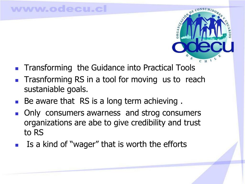 Transforming the Guidance into Practical Tools • Trasnforming RS in a tool for moving us to reach sustaniable goals. • Be aware that RS is a long term achieving . • Only consumers awarness and strog consumers organizations are abe to give credibility and trust to RS • Is a kind of “wager” that is worth the efforts