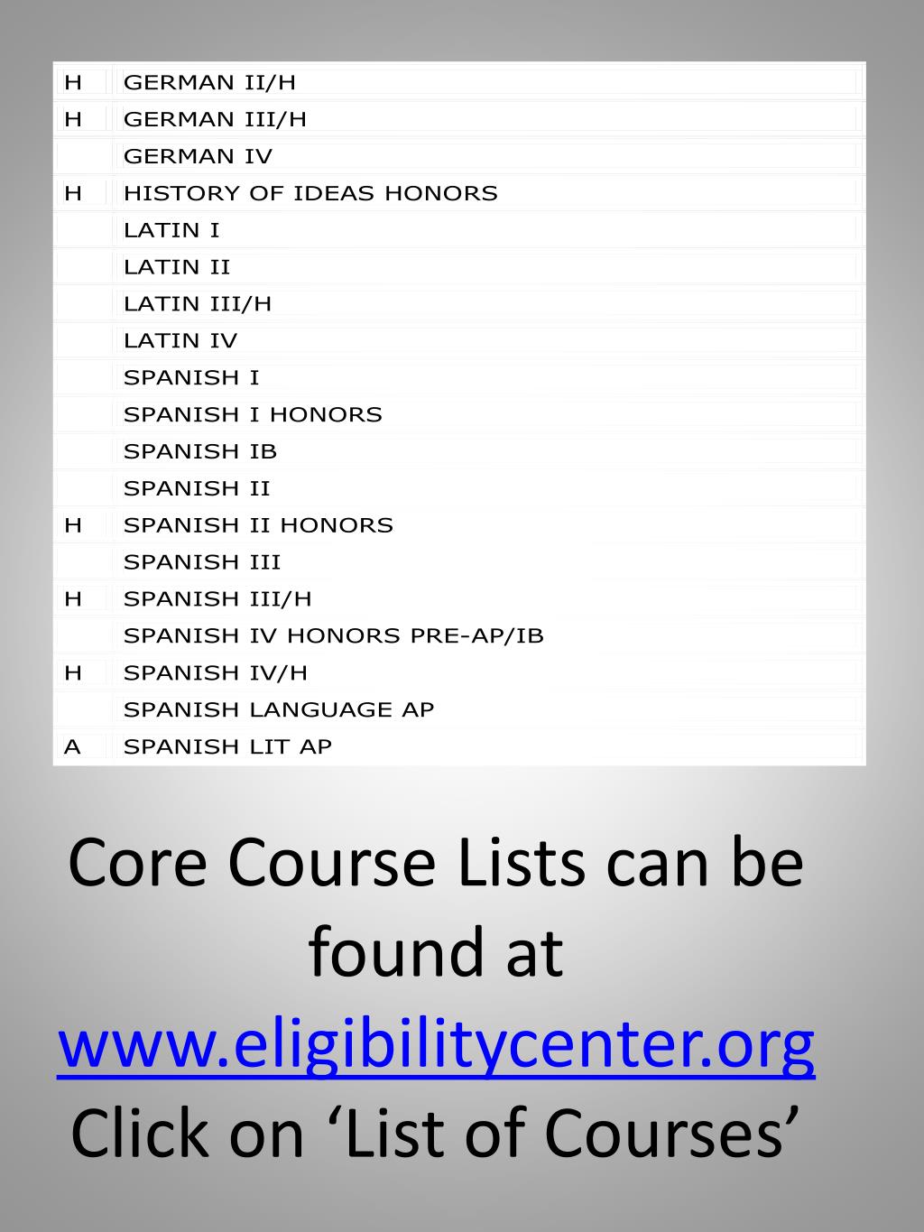 Core Course Lists can be found at www.eligibilitycenter.orgClick on ‘List of Courses’