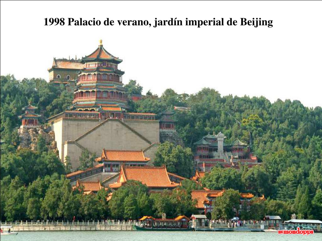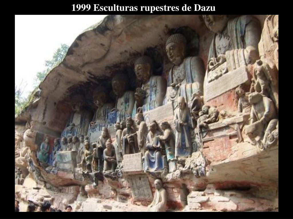 Patrimonio de la humanidad. China. 1998 Palacio de verano, jardín imperial de Beijing. 1998 Templo del cielo, altar imperial de sacrificio en Beijing. 1999 Monte Wuyi. 1987 Sitio del Hombre de Pekín en Zhoukoudian. 1999 Esculturas rupestres de Dazu.