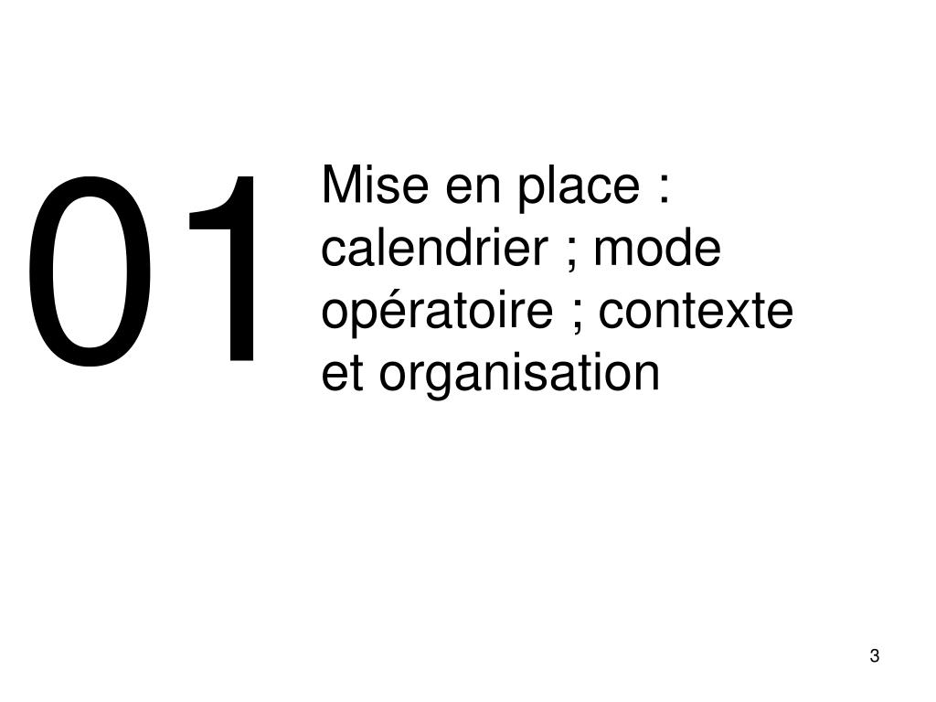 01 Mise en place : calendrier ; mode opératoire ; contexte et organisation 3