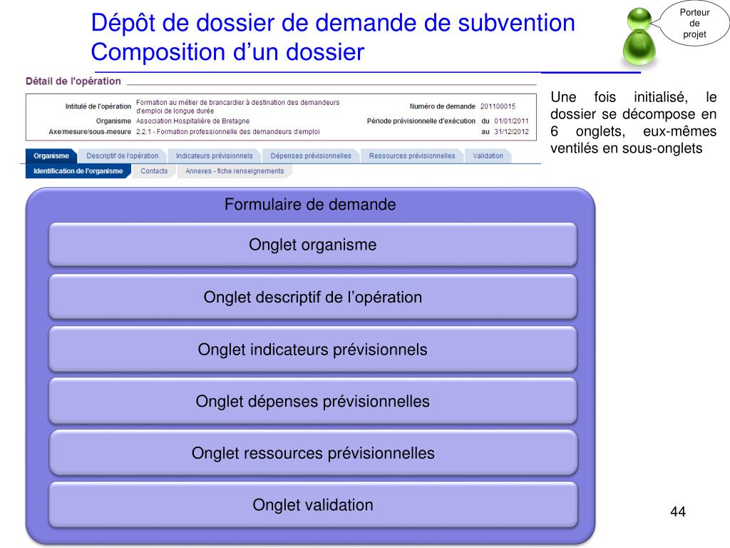 Porteur de projet Dépôt de dossier de demande de subventionComposition d’un dossier Une fois initialisé, le dossier se décompose en 6 onglets, eux-mêmes ventilés en sous-onglets Formulaire de demande Onglet organisme Onglet descriptif de l’opération Onglet indicateurs prévisionnels Onglet dépenses prévisionnelles Onglet ressources prévisionnelles Onglet validation