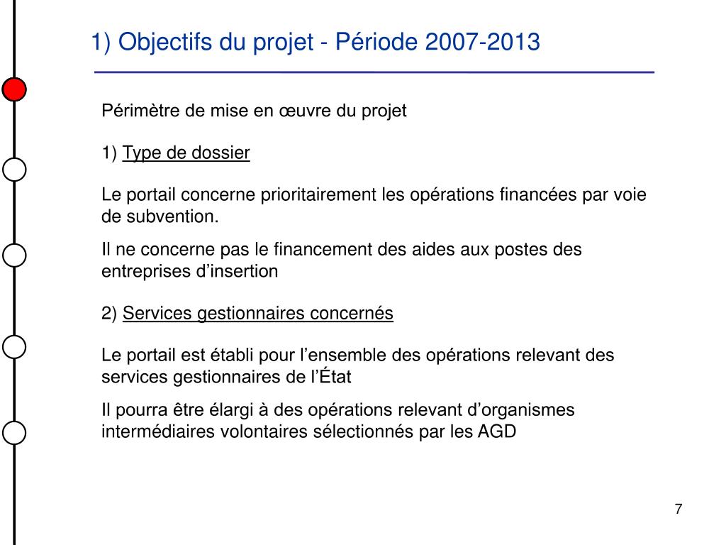 1) Objectifs du projet - Période 2007-2013 Périmètre de mise en œuvre du projet 1) Type de dossier Le portail concerne prioritairement les opérations financées par voie de subvention. Il ne concerne pas le financement des aides aux postes des entreprises d’insertion 2) Services gestionnaires concernés Le portail est établi pour l’ensemble des opérations relevant des services gestionnaires de l’État Il pourra être élargi à des opérations relevant d’organismes intermédiaires volontaires sélectionnés par les AGD 7