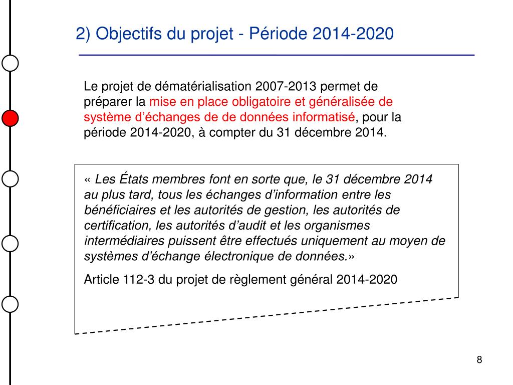 2) Objectifs du projet - Période 2014-2020 Le projet de dématérialisation 2007-2013 permet de préparer la mise en place obligatoire et généralisée de système d’échanges de de données informatisé,pour la période 2014-2020, à compter du 31 décembre 2014. « Les États membres font en sorte que, le 31 décembre 2014 au plus tard, tous les échanges d’information entre les bénéficiaires et les autorités de gestion, les autorités de certification, les autorités d’audit et les organismes intermédiaires puissent être effectués uniquement au moyen de systèmes d’échange électronique de données.» Article 112-3 du projet de règlement général 2014-2020 8