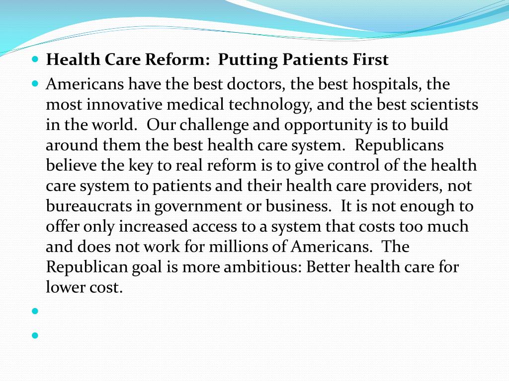Health Care Reform: Putting Patients First • Americans have the best doctors, the best hospitals, the most innovative medical technology, and the best scientists in the world. Our challenge and opportunity is to build around them the best health care system. Republicans believe the key to real reform is to give control of the health care system to patients and their health care providers, not bureaucrats in government or business. It is not enough to offer only increased access to a system that costs too much and does not work for millions of Americans. The Republican goal is more ambitious: Better health care for lower cost.