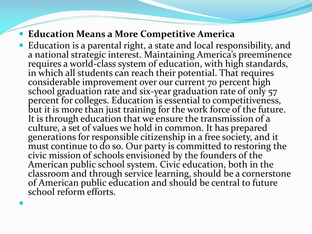 Education Means a More Competitive America • Education is a parental right, a state and local responsibility, and a national strategic interest. Maintaining America’s preeminence requires a world-class system of education, with high standards, in which all students can reach their potential. That requires considerable improvement over our current 70 percent high school graduation rate and six-year graduation rate of only 57 percent for colleges. Education is essential to competitiveness, but it is more than just training for the work force of the future. It is through education that we ensure the transmission of a culture, a set of values we hold in common. It has prepared generations for responsible citizenship in a free society, and it must continue to do so. Our party is committed to restoring the civic mission of schools envisioned by the founders of the American public school system. Civic education, both in the classroom and through service learning, should be a cornerstone of American public education and should be central to future school reform efforts.