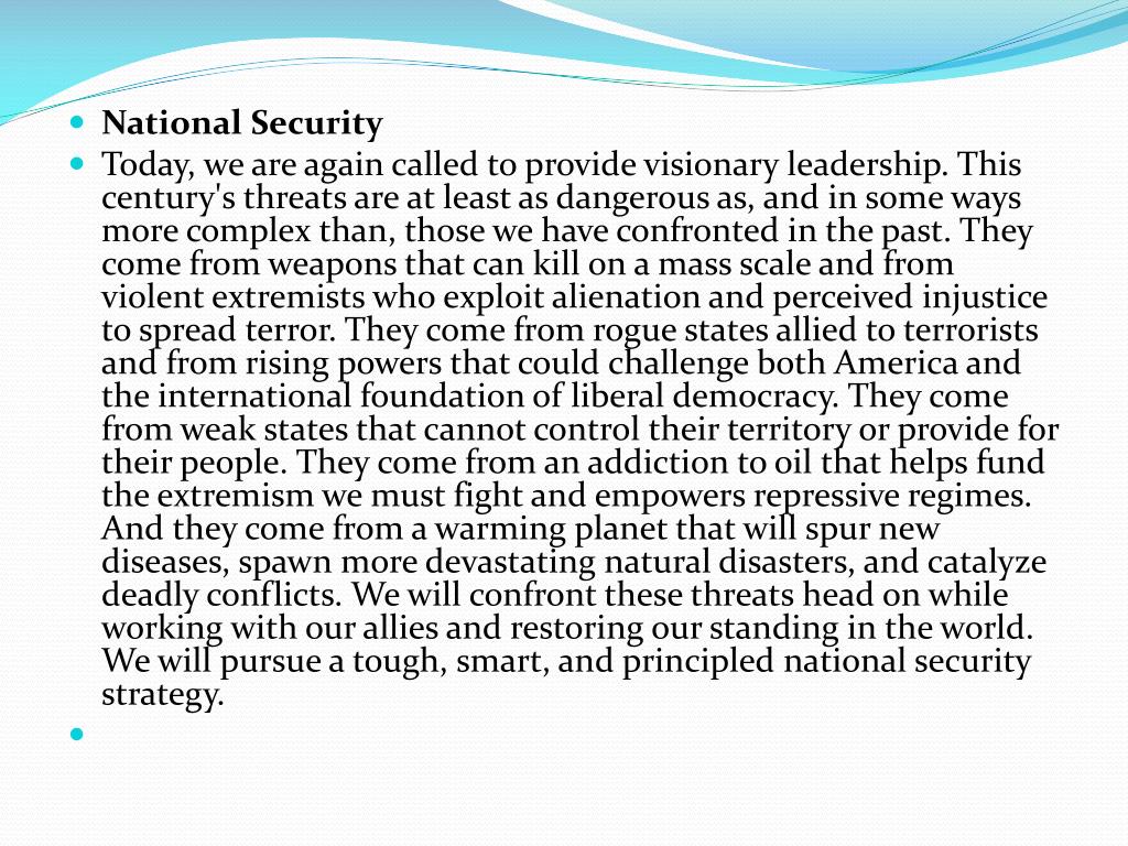 National Security • Today, we are again called to provide visionary leadership. This century's threats are at least as dangerous as, and in some ways more complex than, those we have confronted in the past. They come from weapons that can kill on a mass scale and from violent extremists who exploit alienation and perceived injustice to spread terror. They come from rogue states allied to terrorists and from rising powers that could challenge both America and the international foundation of liberal democracy. They come from weak states that cannot control their territory or provide for their people. They come from an addiction to oil that helps fund the extremism we must fight and empowers repressive regimes. And they come from a warming planet that will spur new diseases, spawn more devastating natural disasters, and catalyze deadly conflicts. We will confront these threats head on while working with our allies and restoring our standing in the world. We will pursue a tough, smart, and principled national security strategy.