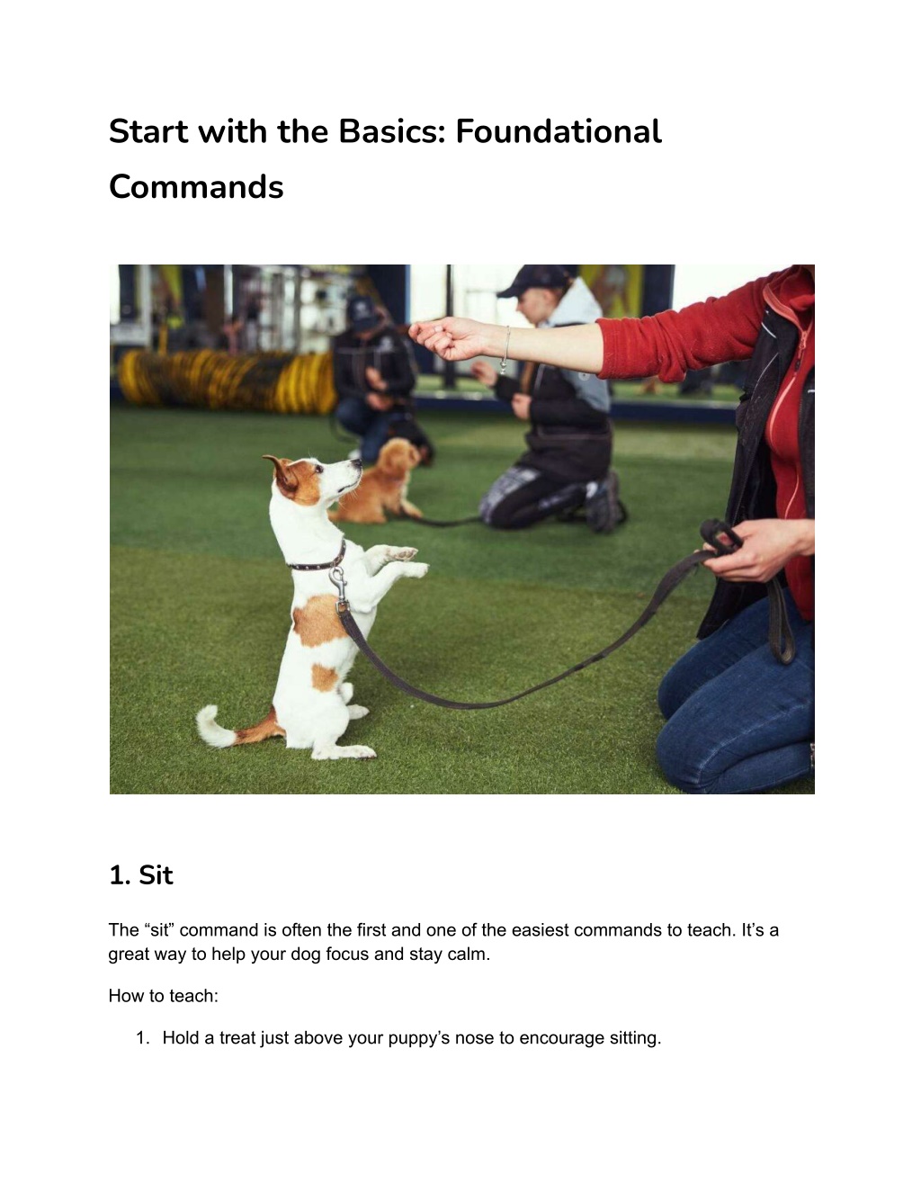 Start with the Basics: Foundational Commands 1. Sit The “sit” command is often the first and one of the easiest commands to teach. It’s a great way to help your dog focus and stay calm. How to teach: 1. Hold a treat just above your puppy’s nose to encourage sitting.
