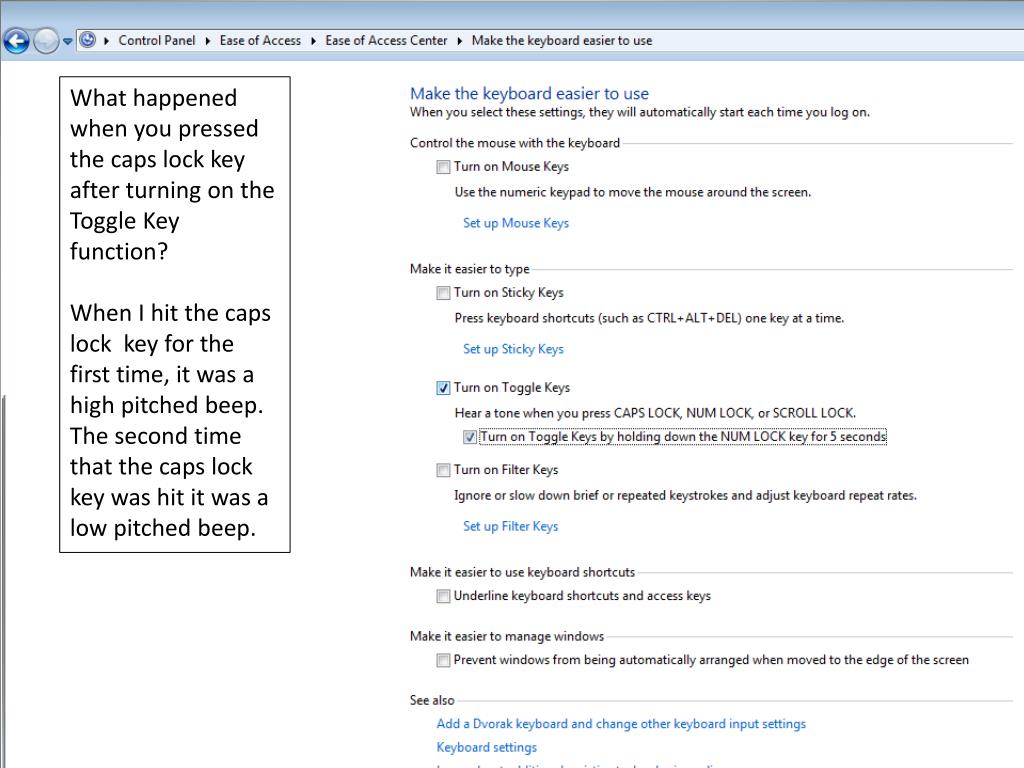 What happened when you pressed the caps lock key after turning on the Toggle Key function? When I hit the caps lock key for the first time, it was a high pitched beep. The second time that the caps lock key was hit it was a low pitched beep.