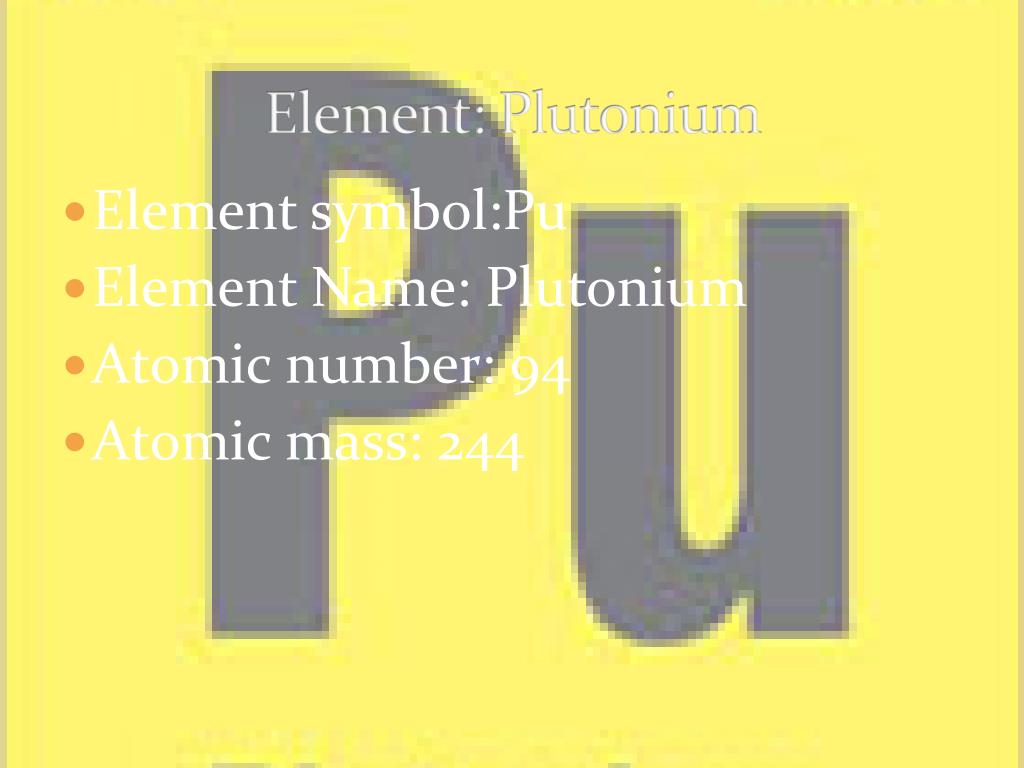 Element: Plutonium • Element symbol:Pu • Element Name: Plutonium • Atomic number: 94 • Atomic mass: 244