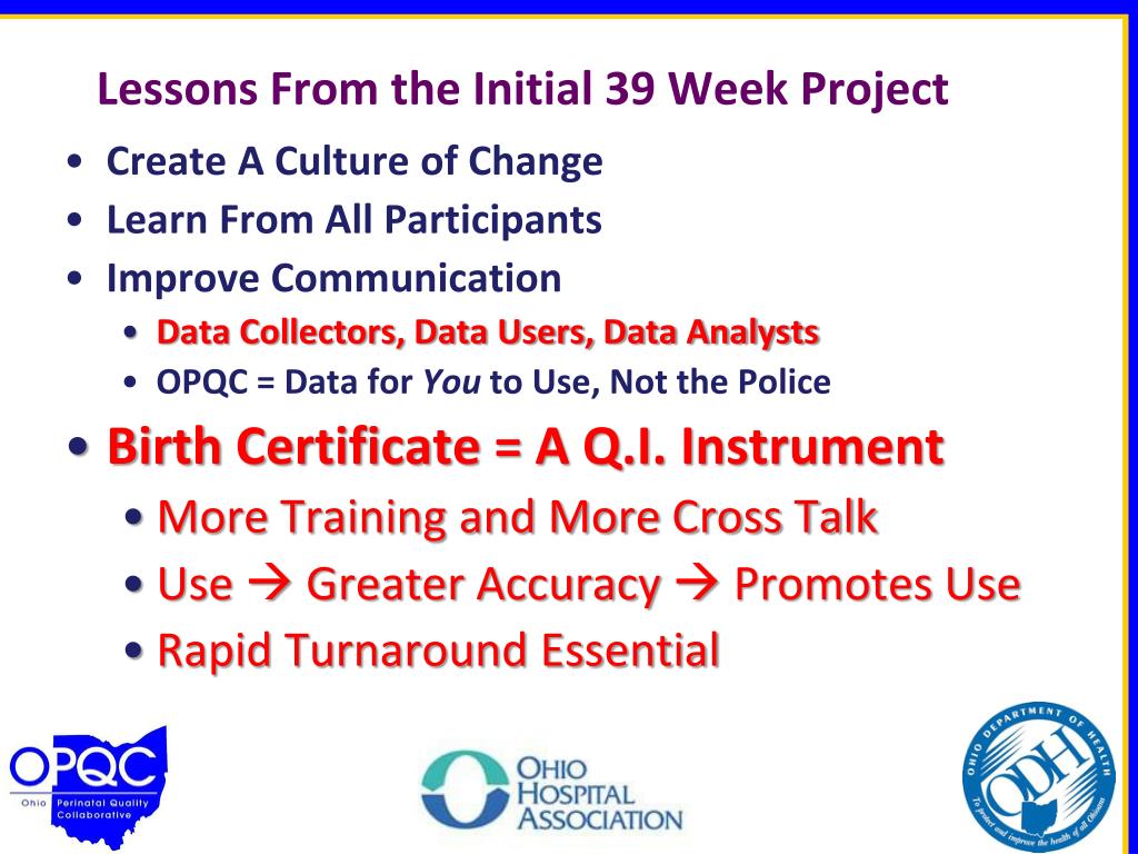 Lessons From the Initial 39 Week Project • Create A Culture of Change • Learn From All Participants • Improve Communication • Data Collectors, Data Users, Data Analysts • OPQC = Data for You to Use, Not the Police • Birth Certificate = A Q.I. Instrument • More Training and More Cross Talk • Use Greater Accuracy Promotes Use • Rapid Turnaround Essential