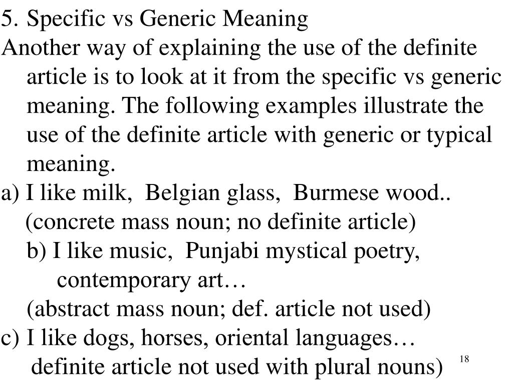5. Specific vs Generic Meaning • Another way of explaining the use of the definite article is to look at it from the specific vs generic meaning. The following examples illustrate the use of the definite article with generic or typical meaning. • a) I like milk, Belgian glass, Burmese wood.. • (concrete mass noun; no definite article)b) I like music, Punjabi mystical poetry, contemporary art… (abstract mass noun; def. article not used) • I like dogs, horses, oriental languages… • definite article not used with plural nouns)