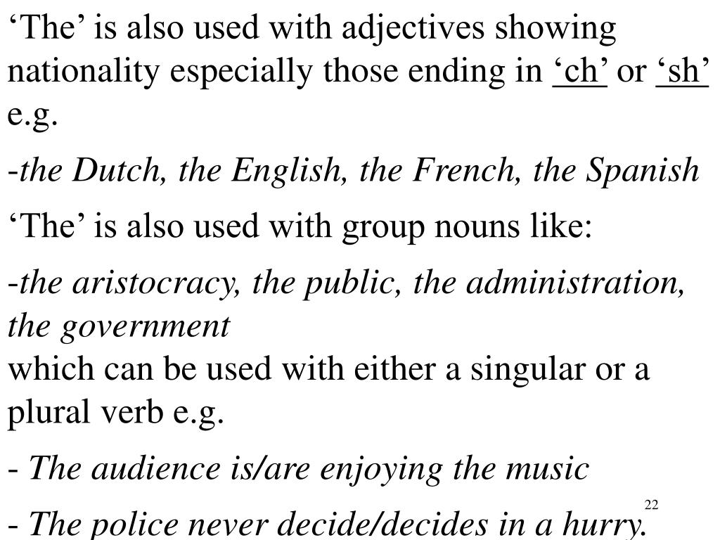 ‘The’ is also used with adjectives showing nationality especially those ending in ‘ch’ or ‘sh’ e.g. • the Dutch, the English, the French, the Spanish • ‘The’ is also used with group nouns like: • the aristocracy, the public, the administration, the governmentwhich can be used with either a singular or a plural verb e.g. • The audience is/are enjoying the music • The police never decide/decides in a hurry.