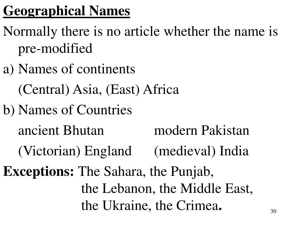 Geographical Names • Normally there is no article whether the name is pre-modified • Names of continents • (Central) Asia, (East) Africa • Names of Countries • ancient Bhutan modern Pakistan • (Victorian) England (medieval) India • Exceptions: The Sahara, the Punjab, the Lebanon, the Middle East, the Ukraine, the Crimea.