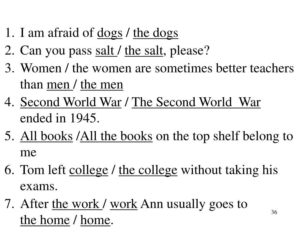Practice 2: Choose the correct form, with or without ‘the’ • 1. I am afraid of dogs / the dogs • 2. Can you pass salt / the salt, please? • 3. Women / the women are sometimes better teachers than men / the men • Second World War / The Second World War ended in 1945. • All books /All the books on the top shelf belong to me • Tom left college / the college without taking his exams. • After the work / work Ann usually goes to the home / home.