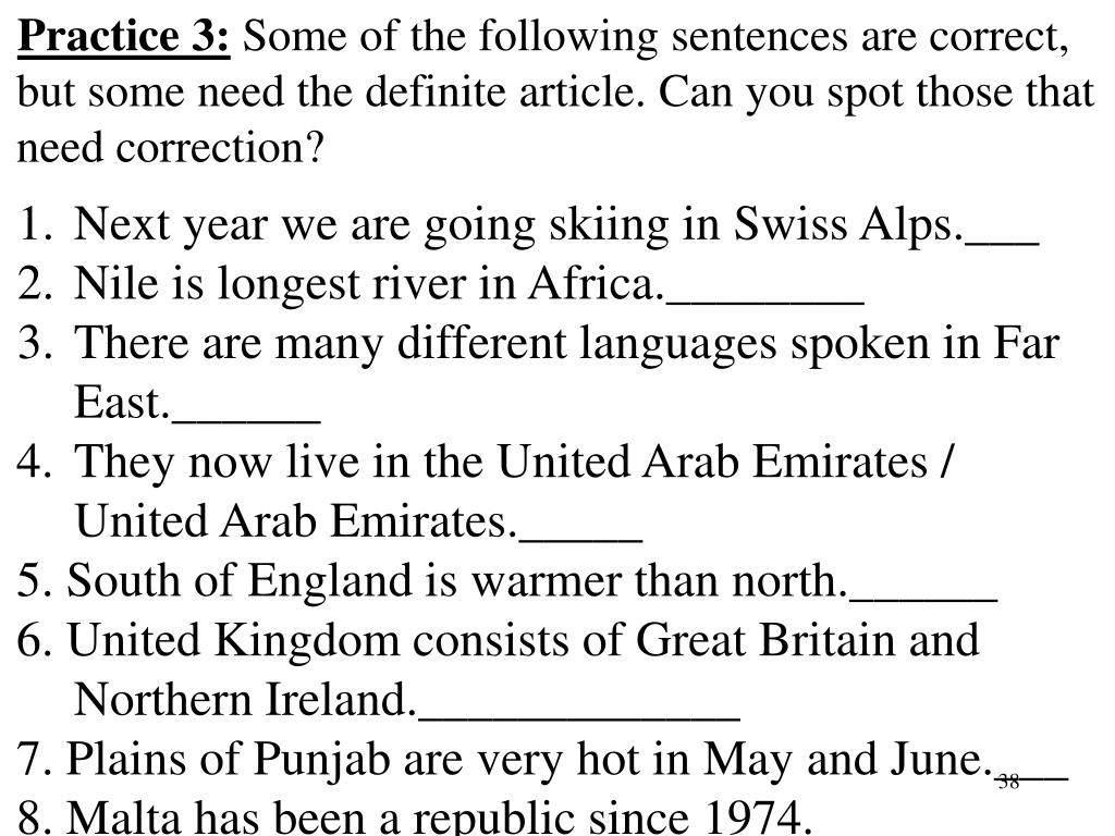 Practice 3: Some of the following sentences are correct, but some need the definite article. Can you spot those that need correction? • 1. Next year we are going skiing in Swiss Alps.___ • 2. Nile is longest river in Africa.________ • 3. There are many different languages spoken in Far East.______ • They now live in the United Arab Emirates / United Arab Emirates._____ • South of England is warmer than north.______ • United Kingdom consists of Great Britain and Northern Ireland._____________ • Plains of Punjab are very hot in May and June.___ • Malta has been a republic since 1974. _______