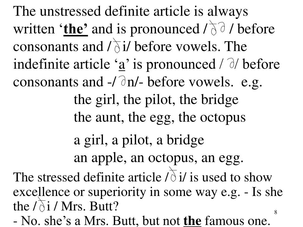 The unstressed definite article is always written ‘the’ and is pronounced / / before consonants and / i/ before vowels. The indefinite article ‘a’ is pronounced / / before consonants and -/ n/- before vowels. e.g. the girl, the pilot, the bridge the aunt, the egg, the octopus a girl, a pilot, a bridge an apple, an octopus, an egg. The stressed definite article / i/ is used to show excellence or superiority in some way e.g. - Is she the / i / Mrs. Butt? - No. she’s a Mrs. Butt, but not the famous one.