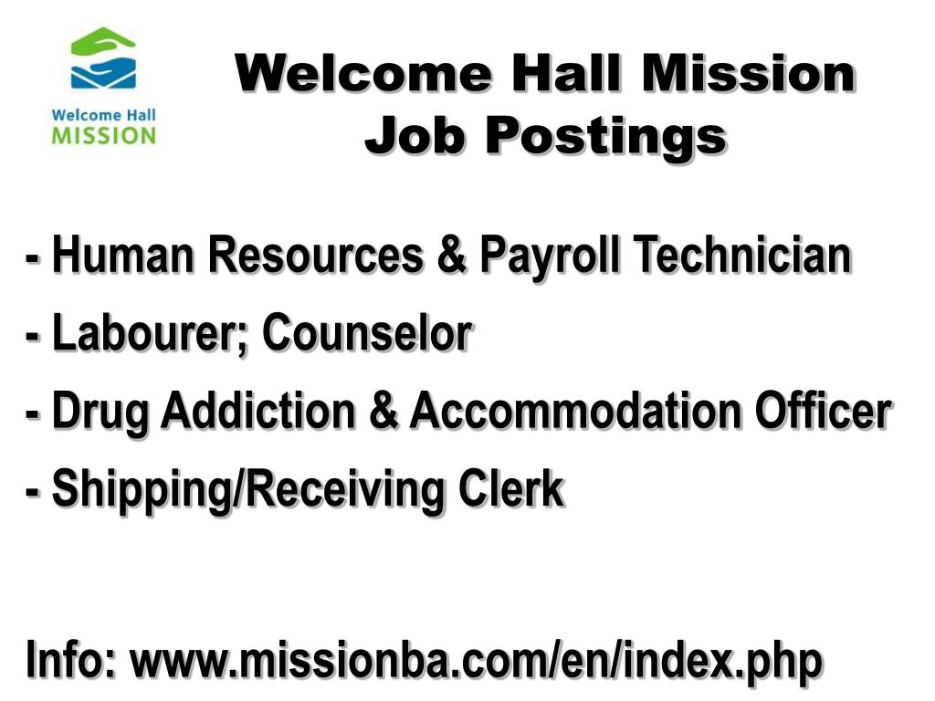 Welcome Hall Mission Job Postings - Human Resources & Payroll Technician - Labourer; Counselor - Drug Addiction & Accommodation Officer - Shipping/Receiving Clerk Info: www.missionba.com/en/index.php