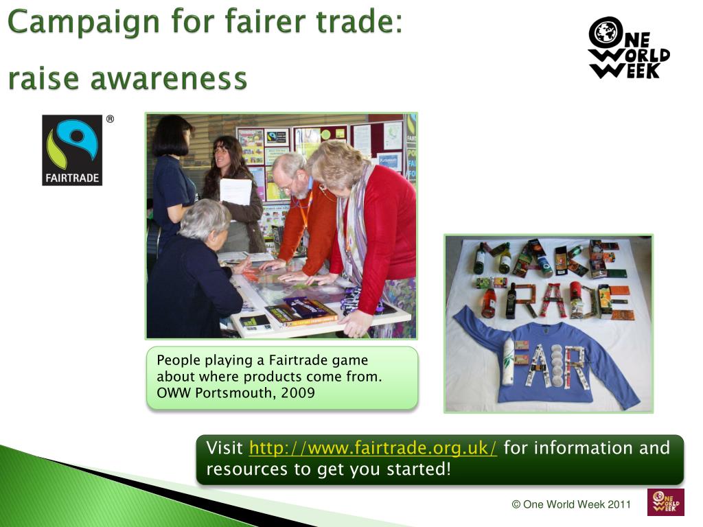 Campaign for fairer trade: raise awareness People playing a Fairtrade game about where products come from. OWW Portsmouth, 2009 Visit http://www.fairtrade.org.uk/ for information and resources to get you started!