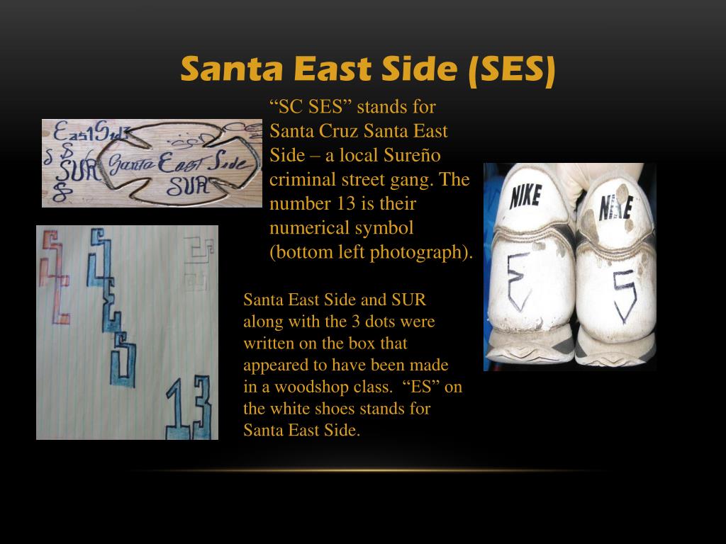 Santa East Side (SES) “SC SES” stands for Santa Cruz Santa East Side – a local Sureño criminal street gang. The number 13 is their numerical symbol (bottom left photograph). Santa East Side and SUR along with the 3 dots were written on the box that appeared to have been made in a woodshop class. “ES” on the white shoes stands for Santa East Side.