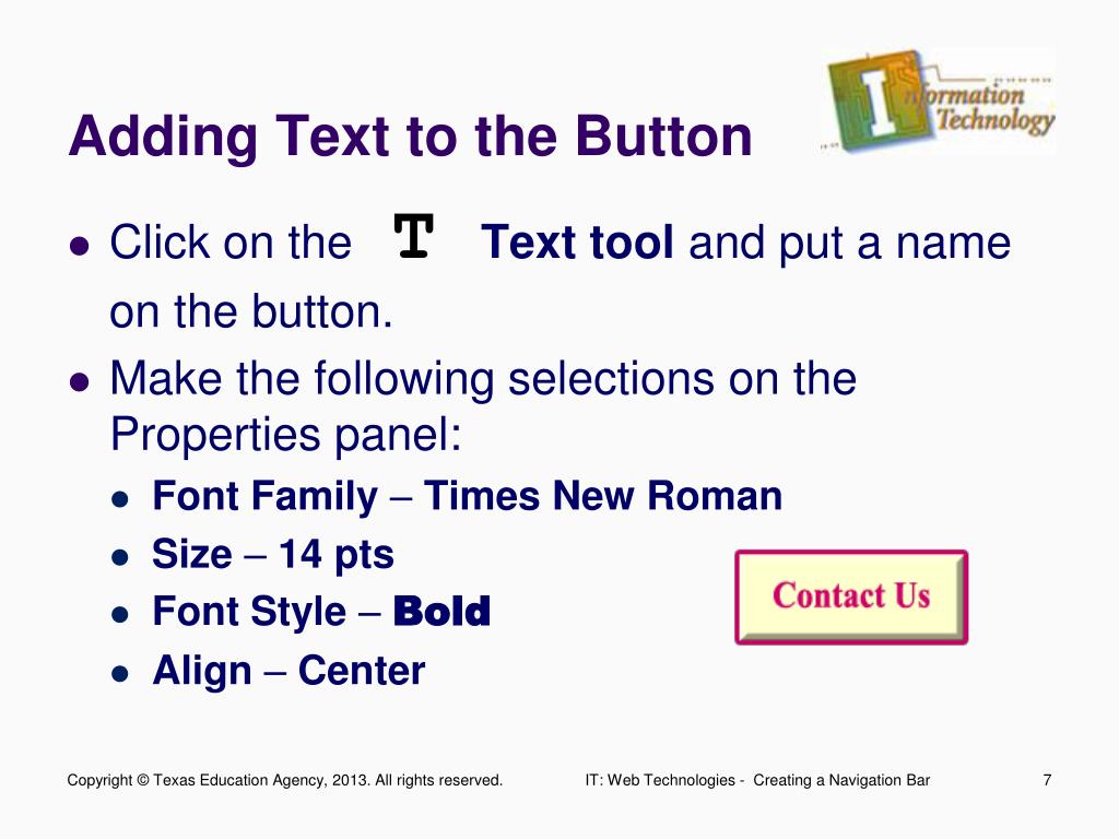 Adding Text to the Button • Click on the TText tool and put a name on the button. • Make the following selections on the Properties panel: • Font Family – Times New Roman • Size – 14 pts • Font Style – Bold • Align – Center IT: Web Technologies - Creating a Navigation Bar