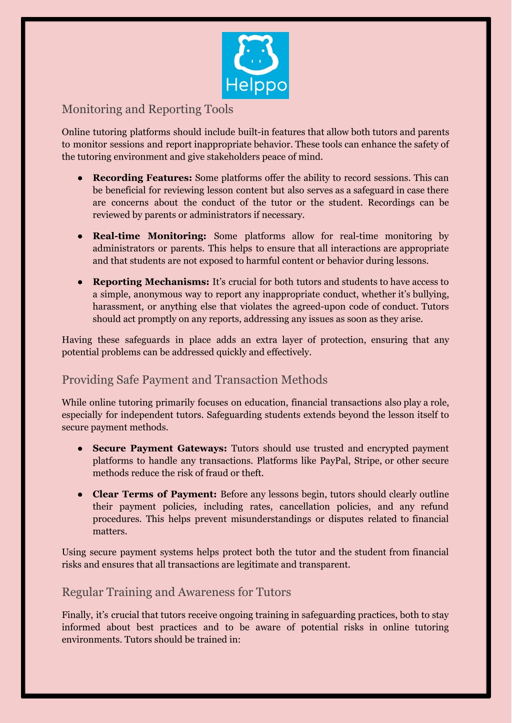Monitoring and Reporting Tools Online tutoring platforms should include built-in features that allow both tutors and parents to monitor sessions and report inappropriate behavior. These tools can enhance the safety of the tutoring environment and give stakeholders peace of mind. ● Recording Features: Some platforms offer the ability to record sessions. This can be beneficial for reviewing lesson content but also serves as a safeguard in case there are concerns about the conduct of the tutor or the student. Recordings can be reviewed by parents or administrators if necessary. ● Real-time Monitoring: Some platforms allow for real-time monitoring by administrators or parents. This helps to ensure that all interactions are appropriate and that students are not exposed to harmful content or behavior during lessons. ● Reporting Mechanisms: It’s crucial for both tutors and students to have access to a simple, anonymous way to report any inappropriate conduct, whether it’s bullying, harassment, or anything else that violates the agreed-upon code of conduct. Tutors should act promptly on any reports, addressing any issues as soon as they arise. Having these safeguards in place adds an extra layer of protection, ensuring that any potential problems can be addressed quickly and effectively. Providing Safe Payment and Transaction Methods While online tutoring primarily focuses on education, financial transactions also play a role, especially for independent tutors. Safeguarding students extends beyond the lesson itself to secure payment methods. ● Secure Payment Gateways: Tutors should use trusted and encrypted payment platforms to handle any transactions. Platforms like PayPal, Stripe, or other secure methods reduce the risk of fraud or theft. ● Clear Terms of Payment: Before any lessons begin, tutors should clearly outline their payment policies, including rates, cancellation policies, and any refund procedures. This helps prevent misunderstandings or disputes related to financial matters. Using secure payment systems helps protect both the tutor and the student from financial risks and ensures that all transactions are legitimate and transparent. Regular Training and Awareness for Tutors Finally, it’s crucial that tutors receive ongoing training in safeguarding practices, both to stay informed about best practices and to be aware of potential risks in online tutoring environments. Tutors should be trained in: