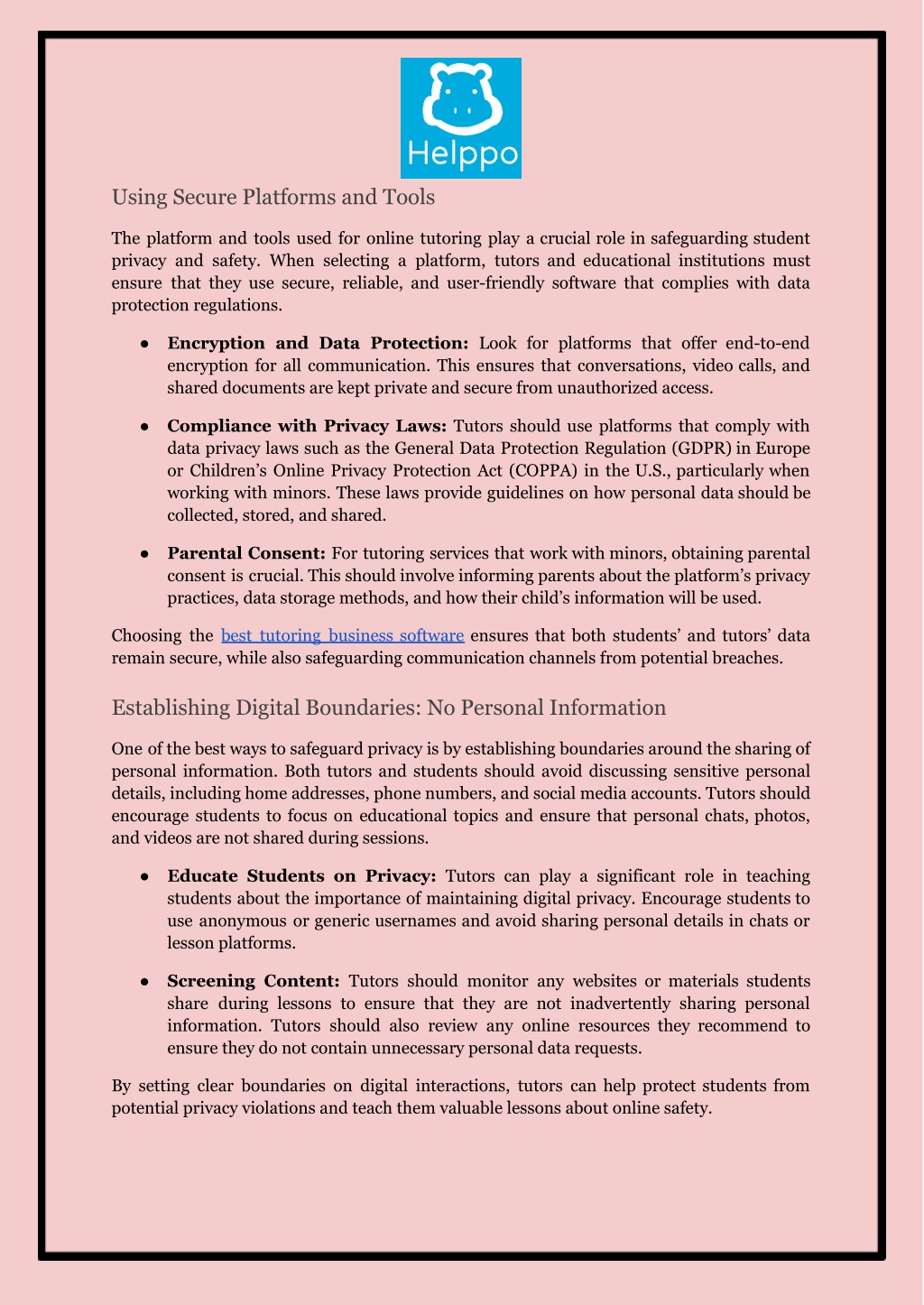 Using Secure Platforms and Tools The platform and tools used for online tutoring play a crucial role in safeguarding student privacy and safety. When selecting a platform, tutors and educational institutions must ensure that they use secure, reliable, and user-friendly software that complies with data protection regulations. ● Encryption and Data Protection: Look for platforms that offer end-to-end encryption for all communication. This ensures that conversations, video calls, and shared documents are kept private and secure from unauthorized access. ● Compliance with Privacy Laws: Tutors should use platforms that comply with data privacy laws such as the General Data Protection Regulation (GDPR) in Europe or Children’s Online Privacy Protection Act (COPPA) in the U.S., particularly when working with minors. These laws provide guidelines on how personal data should be collected, stored, and shared. ● Parental Consent: For tutoring services that work with minors, obtaining parental consent is crucial. This should involve informing parents about the platform’s privacy practices, data storage methods, and how their child’s information will be used. Choosing the best tutoring business software ensures that both students’ and tutors’ data remain secure, while also safeguarding communication channels from potential breaches. Establishing Digital Boundaries: No Personal Information One of the best ways to safeguard privacy is by establishing boundaries around the sharing of personal information. Both tutors and students should avoid discussing sensitive personal details, including home addresses, phone numbers, and social media accounts. Tutors should encourage students to focus on educational topics and ensure that personal chats, photos, and videos are not shared during sessions. ● Educate Students on Privacy: Tutors can play a significant role in teaching students about the importance of maintaining digital privacy. Encourage students to use anonymous or generic usernames and avoid sharing personal details in chats or lesson platforms. ● Screening Content: Tutors should monitor any websites or materials students share during lessons to ensure that they are not inadvertently sharing personal information. Tutors should also review any online resources they recommend to ensure they do not contain unnecessary personal data requests. By setting clear boundaries on digital interactions, tutors can help protect students from potential privacy violations and teach them valuable lessons about online safety.